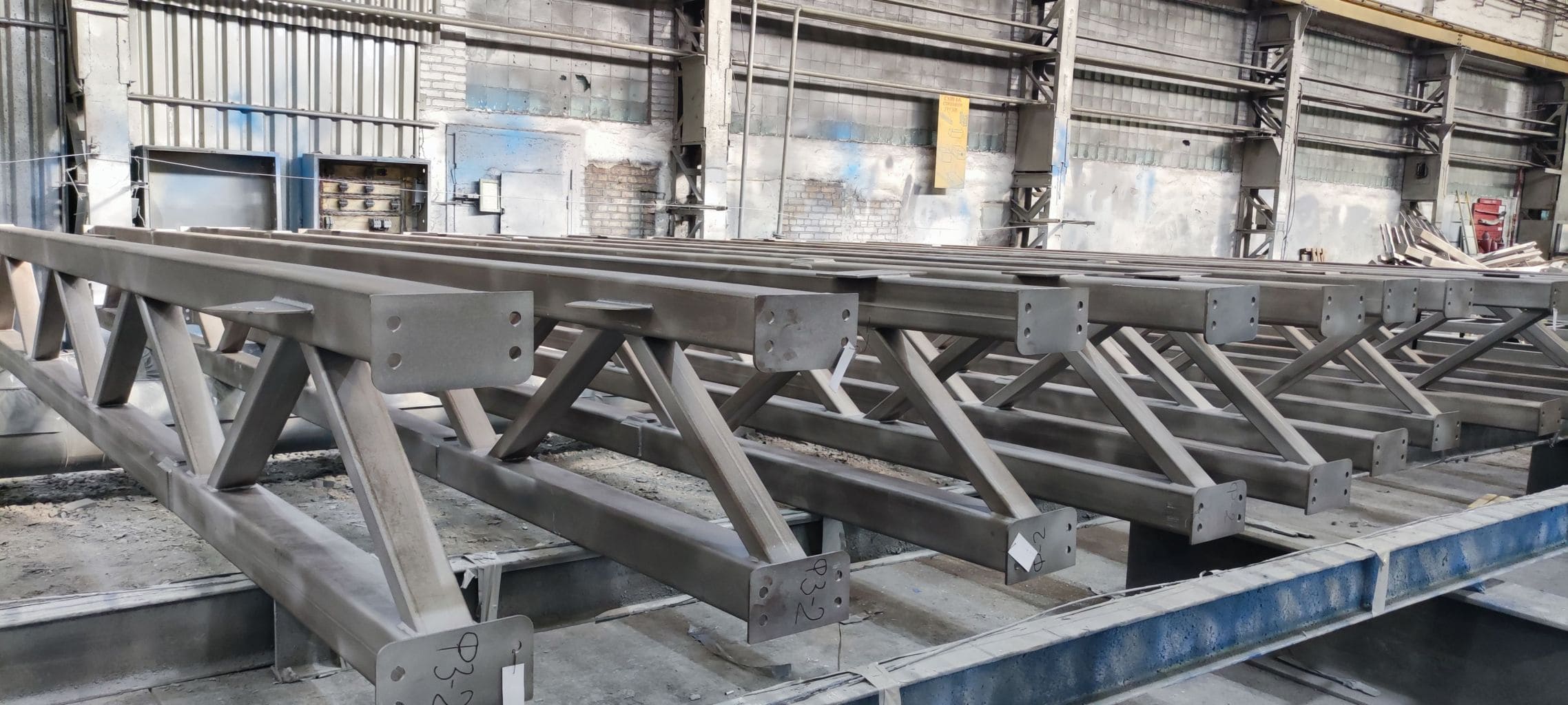 Производим косоуры для лестниц на склад хранения продукции широкого потребления. Конструкция состоит из листового проката, профильных труб, гнутого швеллера. Покрытие – полимерно-порошковое RAL 2008.